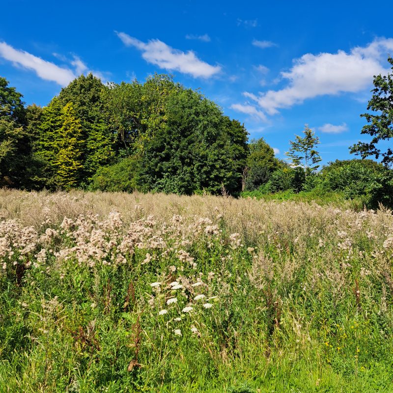 Aufgelaufene Blühwiese der Gemeinde im Juni 2025