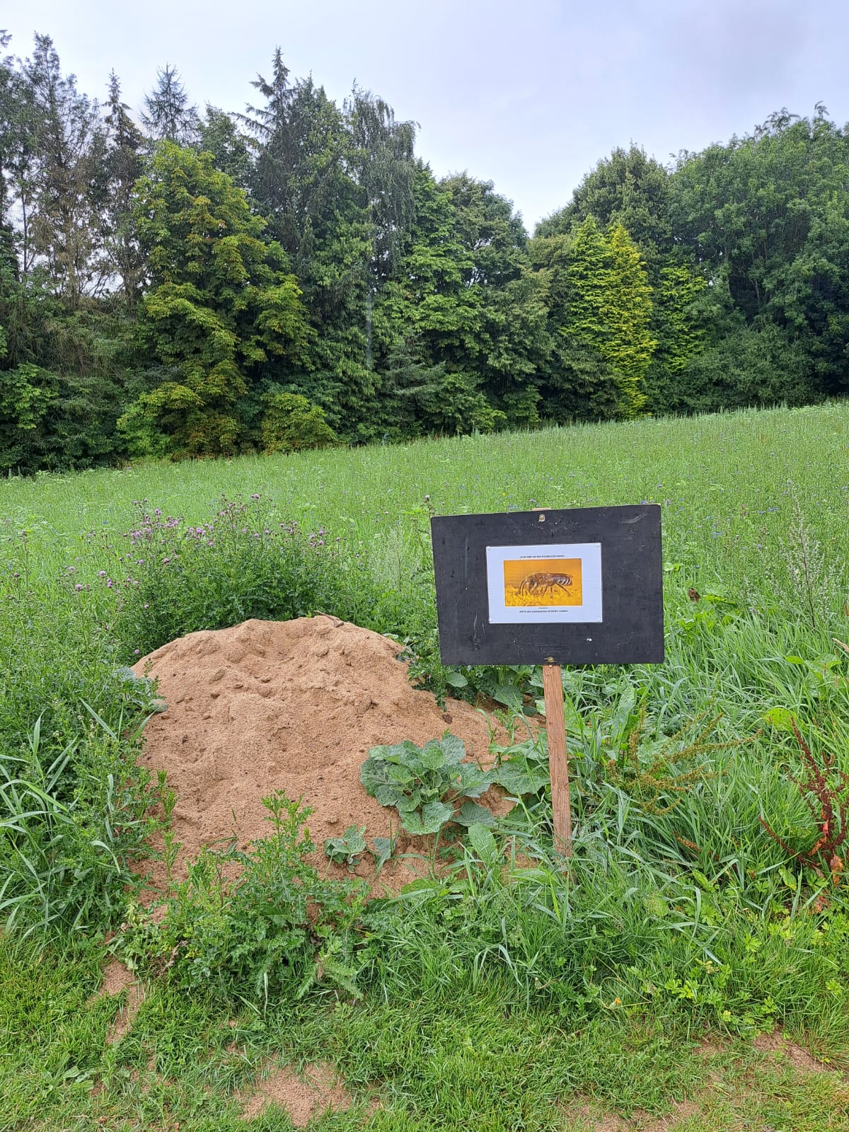 In diesem Jahr liegt ein kleiner Sandberg davor. Hier können die im Boden brütenden Wildbienen einziehen, die den Großteil der hiesigen Wildbienenarten darstellen.