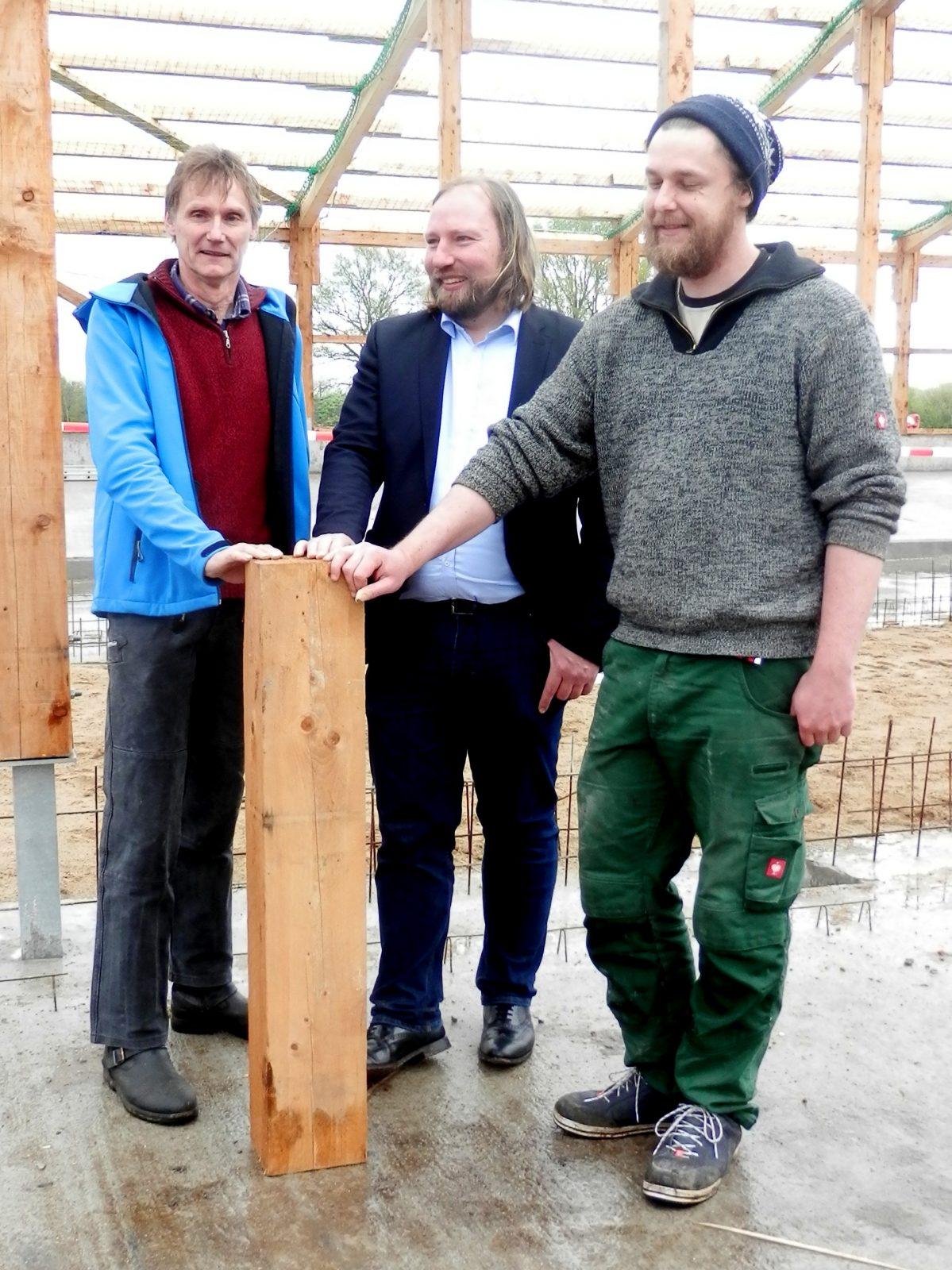 Dirk Kock-Rohwer und Toni Hofreiter auf der Baustelle des neuen Kuhstalls