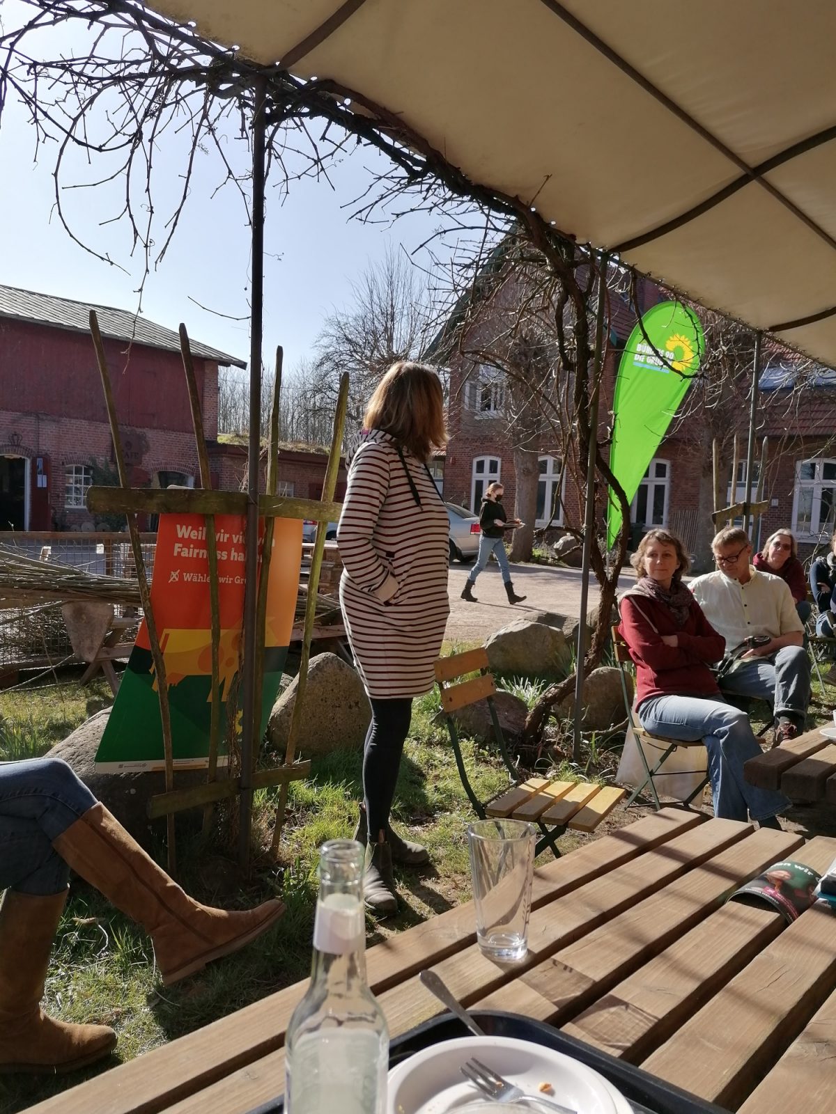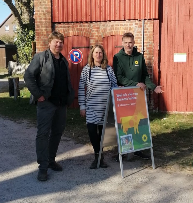 Dirk Kock- Rohwer aus Bönebüttel und Matthias Stührwoldt aus Stolpe standen mit Ihrer langjährigen Erfahrung als Biobauern den Interessierten bei Kaffee und Kuchen in lockerer Atmosphäre zu sämtlichen Fragen zur Verfügung. Dirk Kock-Rohwer, der sowohl als grüner Direktkandidat im Wahlkreis Plön-Ostholstein als auch auf dem 10. Listenplatz der Grünen SH zur diesjährigen Landtagswahl am 8.Mai antritt, berichtete uns von seinen bisherigen Gesprächskontakten mit dem Bauernverband SH, mit ansässigen Landwirt*innen und Schüler*innen.