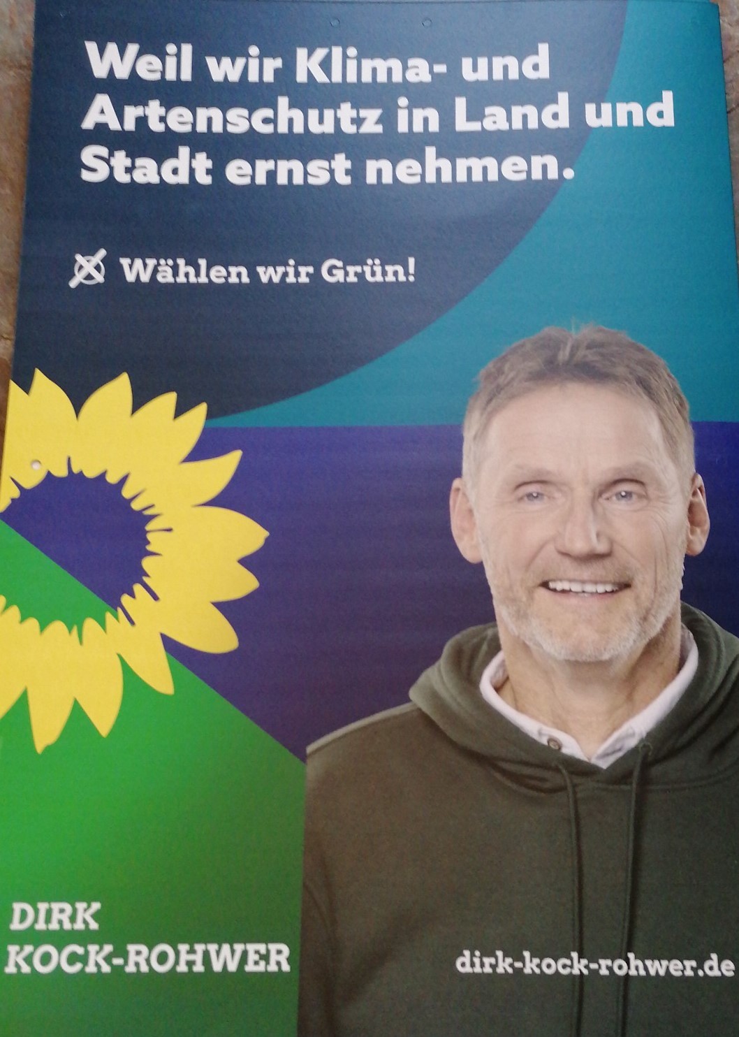 Besonders freuen wir uns über das personalisierte Wahlplakat unseres grünen Direktkandidaten, des Demeter-Landwirts Dipl. Ing. agrar Dirk Kock-Rohwer aus Bönebüttel.
