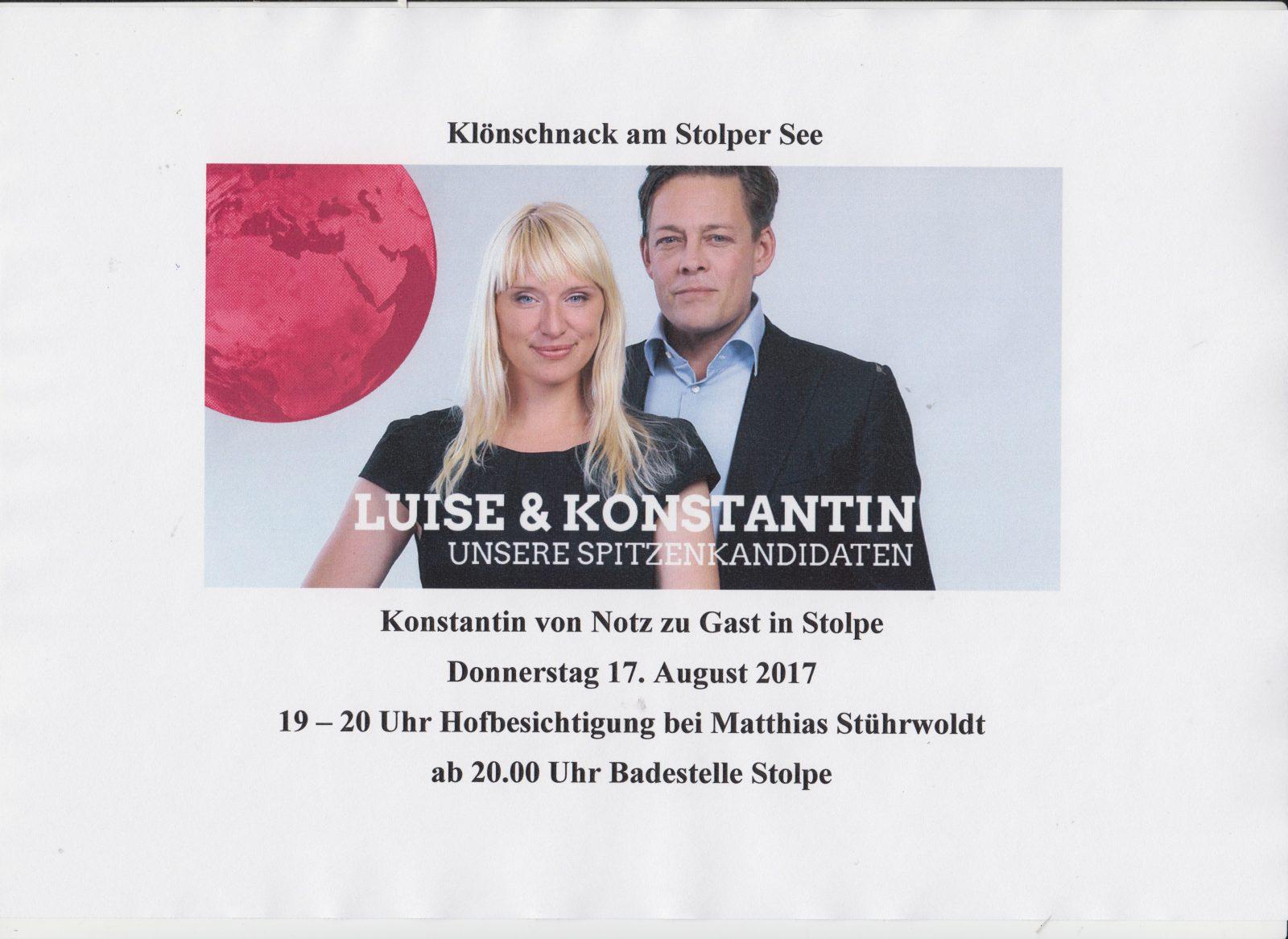 Am Donnerstagabend den 17. August kommt der innenpolitische Sprecher der grünen Bundestagsfraktion und schleswig-holsteinischer Spitzenkandidat Konstantin von Notz nach Stolpe. Um 19 Uhr steht eine Hofbesichtigung auf Matthias Stührwoldts Bio-Hof und den hausnahen Weiden an. Dann geht es um 20 Uhr weiter an der Badestelle Stolpe. Hier steht der Klönschnack im Vordergrund, Grillen und ein Glas Wein auf Matthias Strohklappen trinken und der Gitarrenmusik lauschen. Ganz gemütlich eben…
