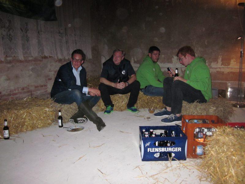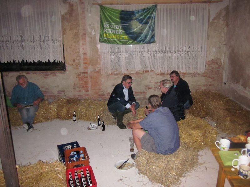 Stolpes Bürgermeister Holger Bajorat zu Besuch. Wir wollten am Stolper See campieren, aber der viele Regen hat uns in unsere Baustelle vertrieben. Hier war es auf Matthias Strohklappen gemütlich und trocken.