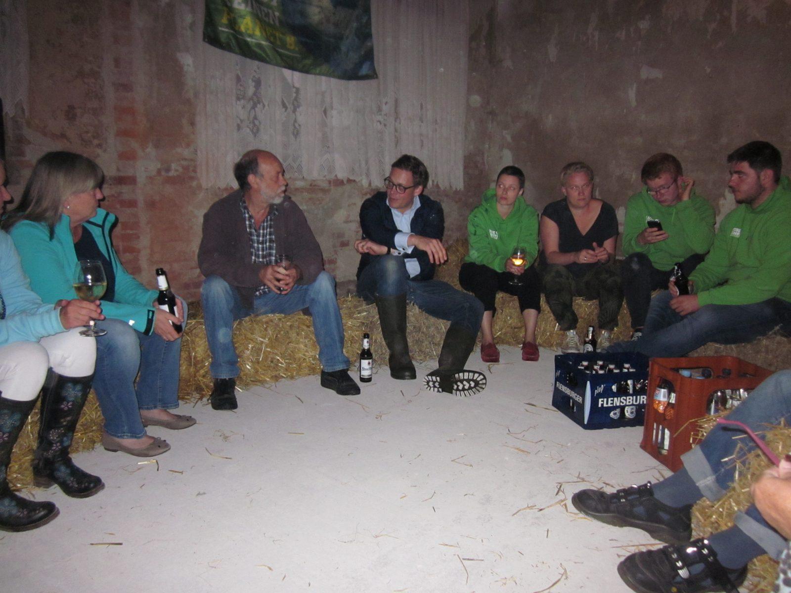 Stolpes Bürgermeister Holger Bajorat zu Besuch. Wir wollten am Stolper See campieren, aber der viele Regen hat uns in unsere Baustelle vertrieben. Hier war es auf Matthias Strohklappen gemütlich und trocken.