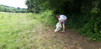 Eine kurze Begehung des Info-Punktes ergab jedoch wieder Grund zum Ärger. Thomas und Klaus sammelten einen ganzen Sack voll Müll. Das Schlimme, Thomas musste über den Zaun klettern, um dort abgelagerte Verpackungen vom Grillen und mengenweise Einmalbesteck und -teller zusammenzusuchen. Auf der Weide der Galloways hat so etwas überhaupt nichts zu suchen.