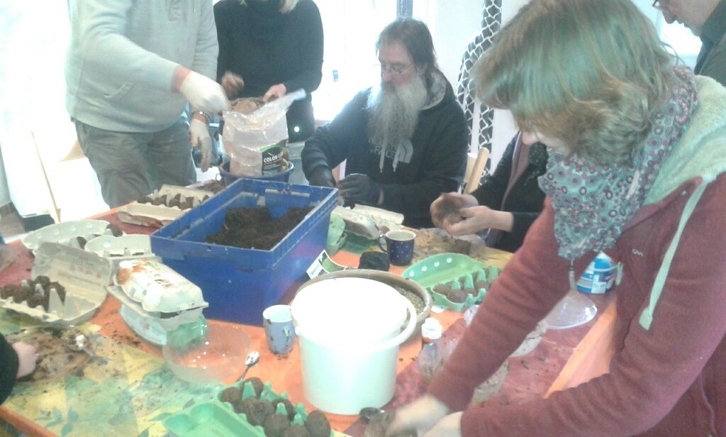 Mit ein wenig Geschick und sensiblem Anpassen der Flüssigkeitsmenge haben die Teilnehmer des Grünen Cafés fleißig Saatbomben hergestellt und in Eierkartons zum Trocknen gelegt. Jeder nahm seine eigens fabrizierten Saatbomben mit nachhause. Nun hoffen wir, dass wir Heinz und Susanne Michalske nicht allzu viel „Dreck“ hinterlassen haben. Denn die Aktion wurde wegen des furchtbaren Wetters in die Tierheilpraxis von Susanne Michalske verlegt. Danke für die Gastfreundschaft!