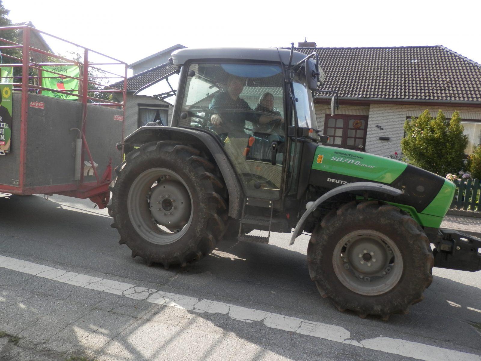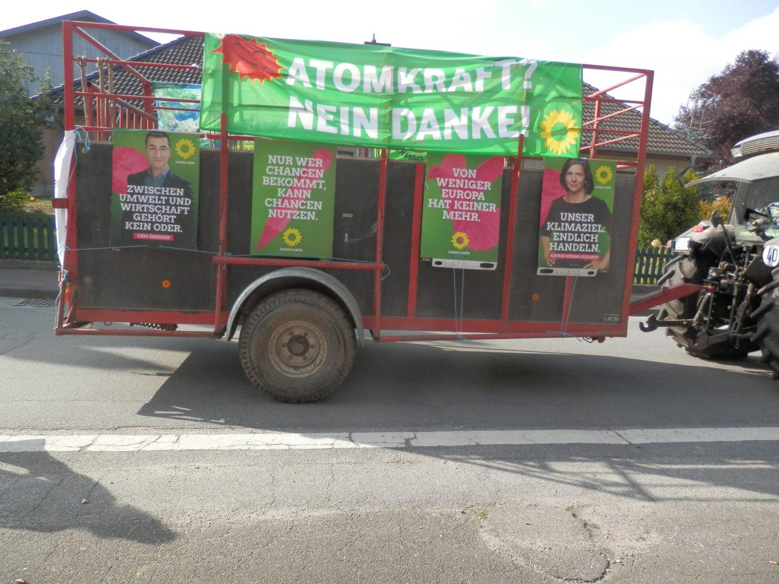 Letzter Wahlkampftag heute: Matthias Stührwoldt hat seinen Viehanhänger mit grünen Plakaten und Transparenten geschmückt, auf dem Marktplatz in Wankendorf. Zusammen mit Susanne auf dem Nebensitz und Tanja in der grünen Jacke auf dem Fahrrad zogen die drei los, um durch Wankendorf zu fahren. Tina bezog derweil am Marktplatz die Stellung.